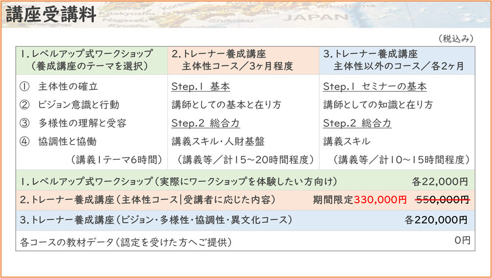 ライセンス料は、MBDGsのワークショップを導入する法人や、ワークショップを実施するトレーナーが、プログラム使用料としてライセンス料を払うものです。